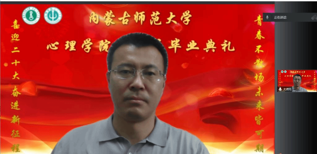 2018级心理学班本科生陈宇作为毕业生代表发言。和大家一起回忆了四年在学校经历的学生工作、志愿服务等美好时光,并表示作为一名心理学子,在即将开启的新征程中,将在未来的工作中刻苦奋进,不负时代,为建设祖国与家乡贡献自己的青春力量,彰显青年一代“请党放心,强国有我”的铮铮誓言。