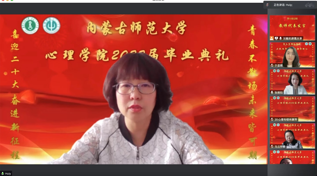 2019级发展与教育心理学硕士研究生乌妮尔同学作为研究生代表发言。她通过回顾在学校学习生活的点滴记忆,表达对母校的感恩、对学院老师的不舍和依恋。她代表毕业生表态:要立志做无私奉献、锐意进取的追梦人,以奋斗有我、强国有我、功成有我的姿态,激荡起新时代的澎湃春潮。