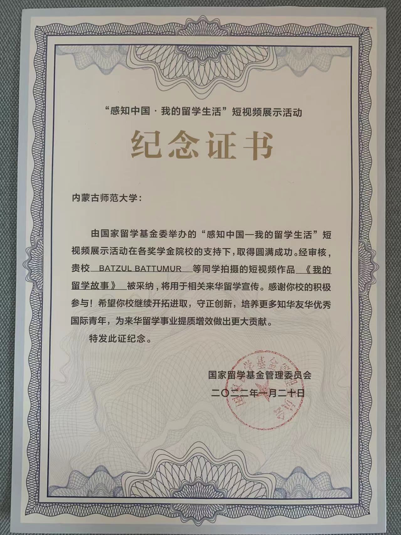 近日,新葡萄留学生BATZUL BATTUMUR同学拍摄的短视频作品《我的留学故事》在国家留学基金委举办的“感知中国——我的留学生活”短视频展示活动中被采纳,将用于相关来华留学宣传。