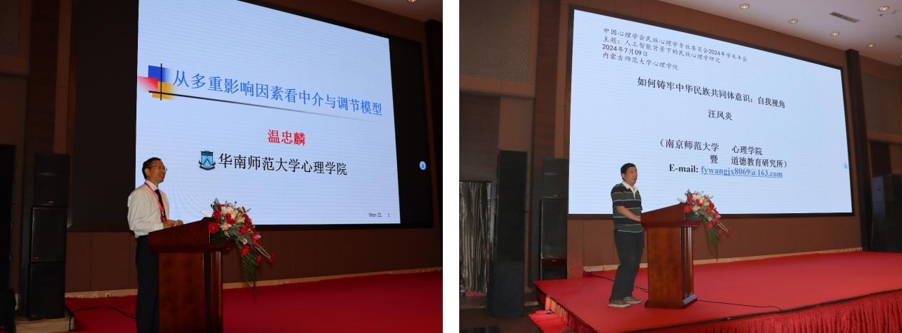 开幕式后,华南师范大学温忠麟教授、南京师范大学汪凤炎教授、上海交通大学李卫东教授、浙江大学周宵研究员和新葡萄88805官网王欣瑜教授分别就《从多重影响因素看中介与调节模型》、《如何铸牢中华民族共同体意识:自我视角》、《AI 与脑机交互技术在抑郁中的探索研究》、《青少年创伤心理的变化特征及代际影响》和《深层文化结构视阈下的中国心理学本土化省思》等议题做了五场特邀报告,分享了民族心理学国内前沿科研成果和实践经验,为与会者奉献了一场高水平的饕餮盛宴。